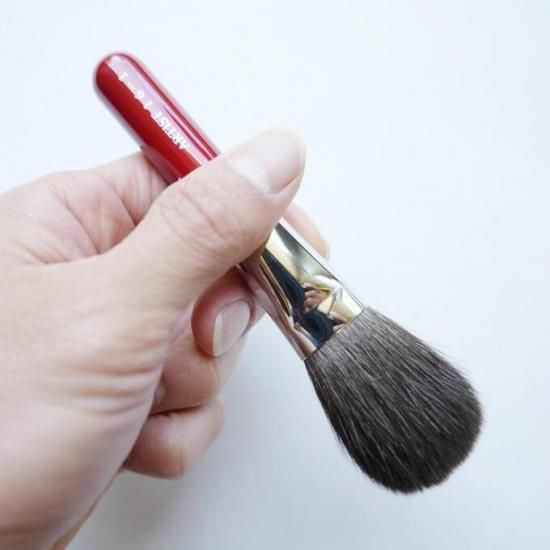 灰リスと言えば、やはりパウダーブラシの王様のイメージが強いようですが、チークカラーでも、粒子の細かいカラーをお使いのお客様に一番のお勧め商品が、このチークブラシです。肌あたりは他にない王道のソフト感、毛足は長くパウダーの含みは類を見ません。チークポイントにゆっくりカラーを入れていただくと、何とも言えないパステルカラーを描き出します。その後何度か往復することで、綺麗な発色をしてくれます。お肌に当てるとき強く押し当てないで下さい。毛先を傷める原因になります。