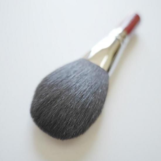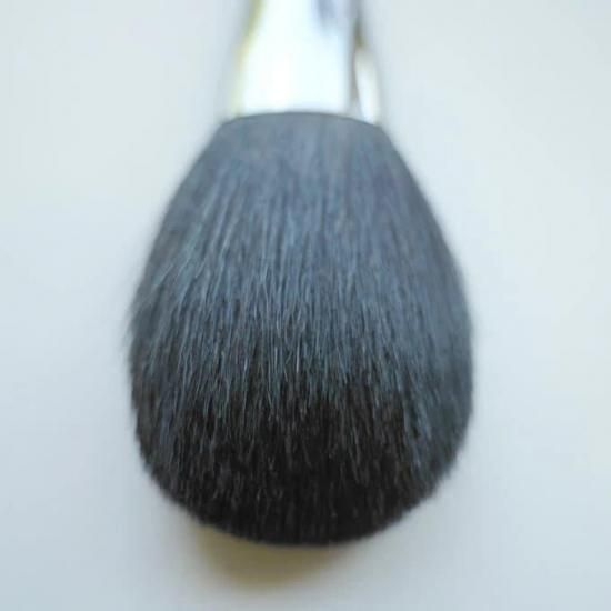 パウダーブラシは、最近この形が多く作られるようになりました。側面が、丸くコットンパフの大きさで、パウダーを側面で取っていただき、顔に付けていただけるようになっています。コットンパフで抑えるのと同様にお使いください。そしてもう片面で無駄なパウダーを取り除き、お顔全体を10秒程度撫でるようにおつかい下さい。金具が平型なので円を描くように使うのはあまりお勧めできません。毛先が折れる原因になります。ただ軽く毛先を使い円を描くのは大丈夫です。腰がありパウダーの含みも良く最高の発色を描くことができます。また、プレスドパウダーやパウダリーファンデーションにもお使いいただけます。毛質は山羊(上質ヤギ)を使っているため、柔らかくコシがあり毛量たっぷりのジャンボブラシです。