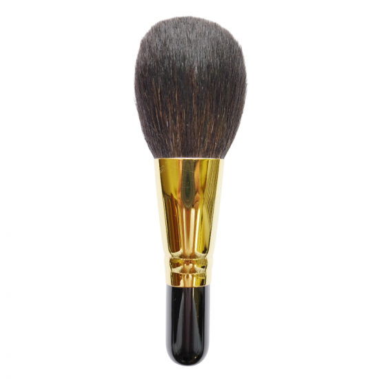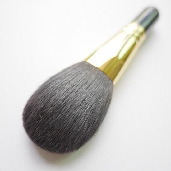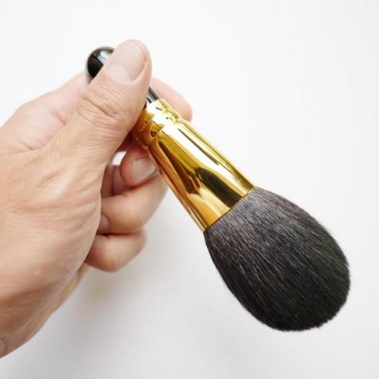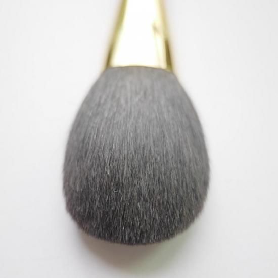 パウダーブラシは、最近この形が多く作られるようになりました。側面が、丸くコットンパフの大きさで、パウダーを側面で取っていただき、顔に付けていただけるようになっています。コットンパフで抑えるのと同様にお使いください。そしてもう片面で無駄なパウダーを取り除き、お顔全体を10秒程度撫でるようにおつかい下さい。金具が平型なので円を描くように使うのはあまりお勧めできません。毛先が折れる原因になります。ただ軽く毛先を使い円を描くのは大丈夫です。腰がありパウダーの含みも良く最高の発色を描くことができます。また、プレスドパウダーやパウダリーファンデーションにもお使いいただけます。