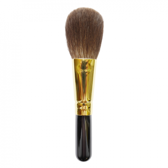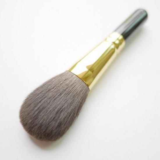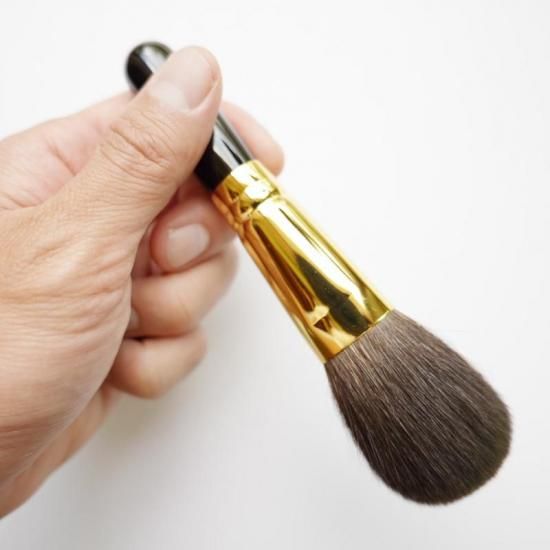 この灰リスパウダーブラシは、側面から毛先まで全面を使ってパウダーを付けることができます。最近はこの形が多く作られるようになりました。パウダリーファンデをお付けになった場合、(手まり筆が最高です。)このブラシにパウダーを含ませ、最初はお肌にゆっくり置くように付けてください。全面にお付けになったら、今度は、顔全体をブラシの側面と毛先までを使って掃くようにして無駄なパウダーを取り除き、また付いていないところにも均等に付くように、ゆっくりお使いください。最高の発色が描けます。リキッドファンデーションをお使いの方は、出来ればコットンパフでパウダーをのせてからお使いください。ムラになったらブラシでゆっくり取ってください。それから顔全体を顎の下から上に掃くようにして、ブラシをお使いください。リキッドの場合は、灰リスで直接パウダーを付けると毛先が細いのでベタベタに固まってしまうことがあります。
