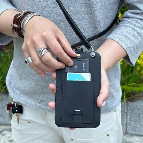 ショルダー付きの携帯ポーチ "EPIC"(エピック)。メインポケットに携帯、ポーチ背面にカードポケット2ヶ所ありICカード、定期などを収納可能。革巻きのボールチェーンをショルダーに採用し、ポーチ上部にはDカンが付属しているので、キーリング等にぶら下げる方が出来ます。ポーチとショルダーはオリジナルスクリューネジで止めており、取り外しも可能です。